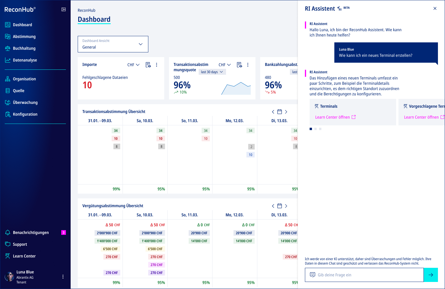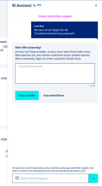 Der Reconciliation Intelligence (RI) Assistent liefert dir sofortige Antworten, hilft dir, ReconHub-Funktionen besser zu verstehen, und führt dich direkt zu den richtigen Informationen — alles, ohne die Seite zu verlassen.