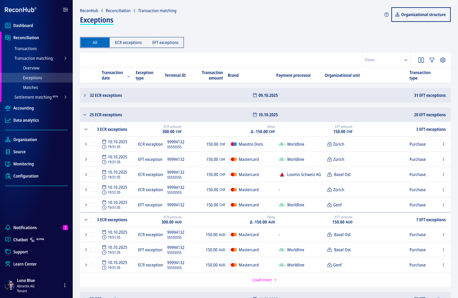 When you select an exception, the filter button stays active. This lets you fine-tune your filters and quickly find matching exceptions while keeping your current selection. You can also filter the ECR and EFT pages separately in the filter bar to refine your results more easily.