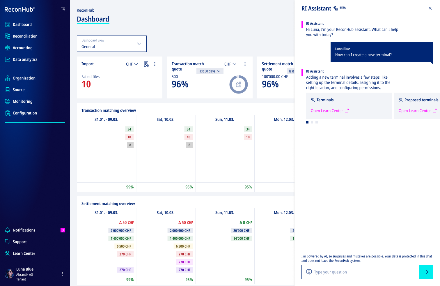 We’re excited to introduce the improved Reconciliation Intelligence (RI) Assistant Beta, designed to help you get even more value from ReconHub. You can now ask questions about your transaction data as well as about features and functionality within ReconHub.