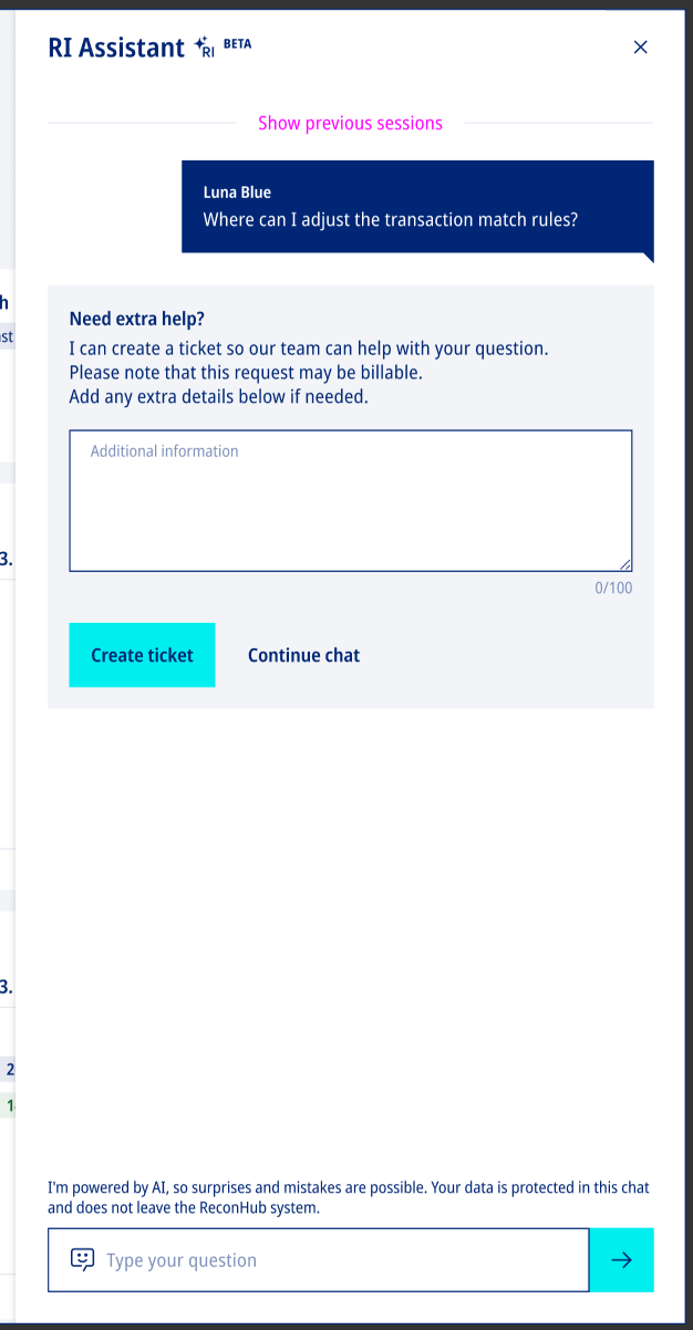 If you need additional assistance, you can create a support ticket directly from within the RI Assistant to connect with a ReconHub Support specialist.